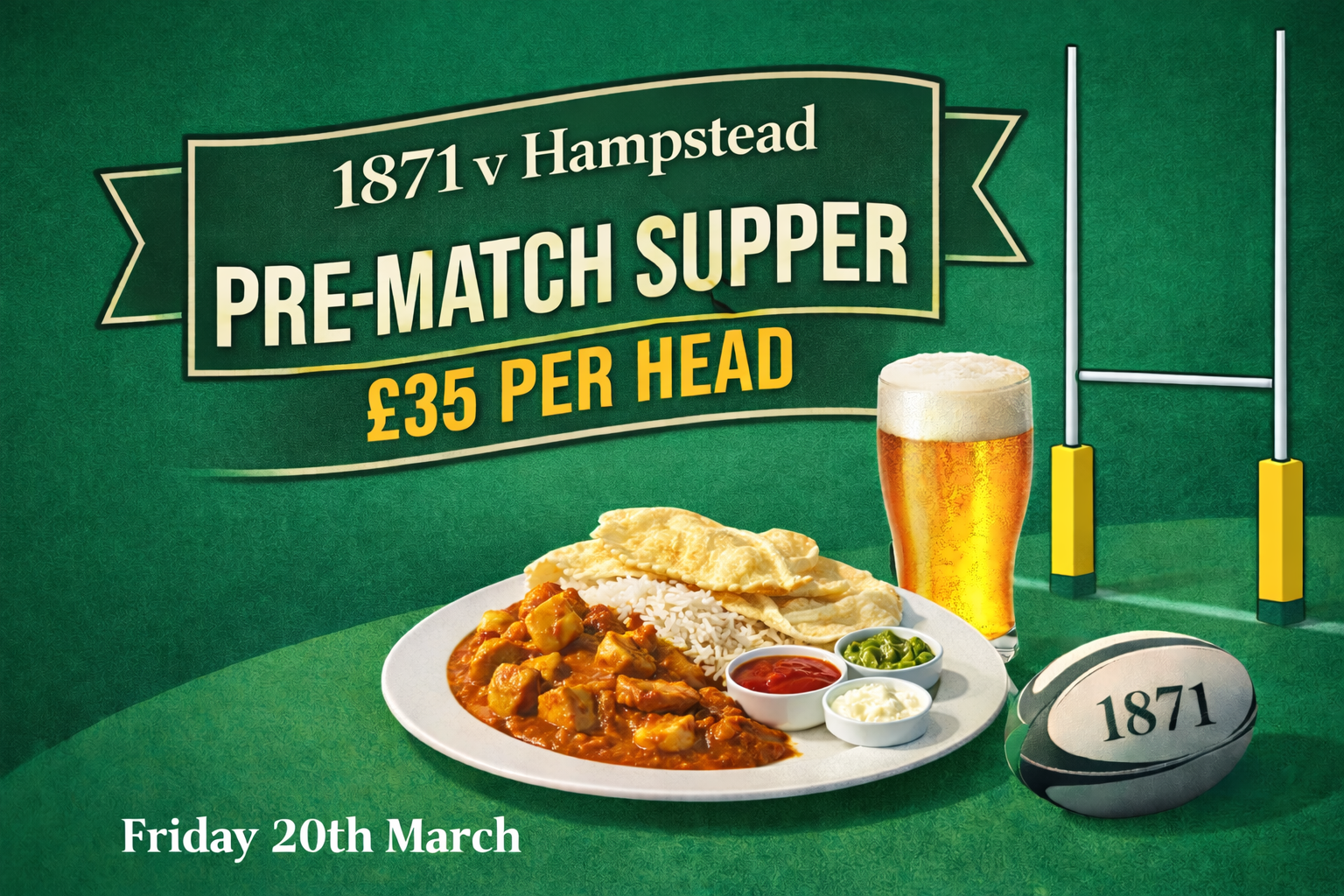 Pre-match, two courses, Curry Supper, meet 18:00 (or earlier) seated 18:30